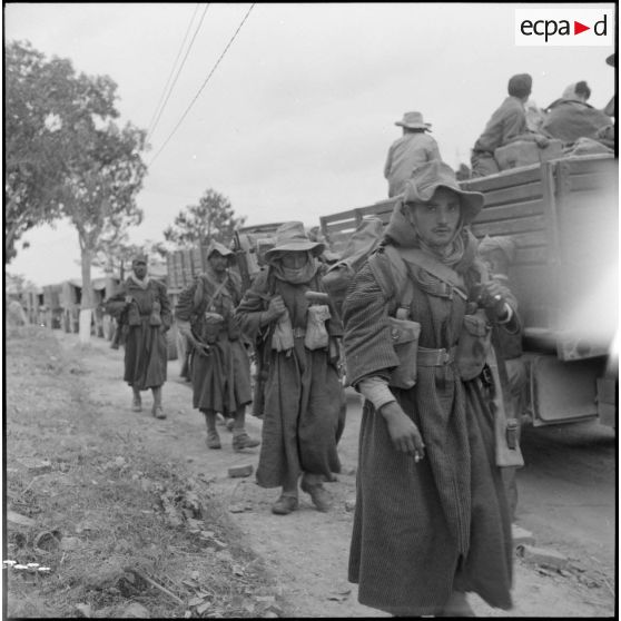 Un groupe de la 7e compagnie du 1er régiment de tirailleurs algériens (1er RTA) patrouille dans les environs de Moi Phat pour tenter de couper la retraite aux soldats du Viêt-minh fuyant le village.