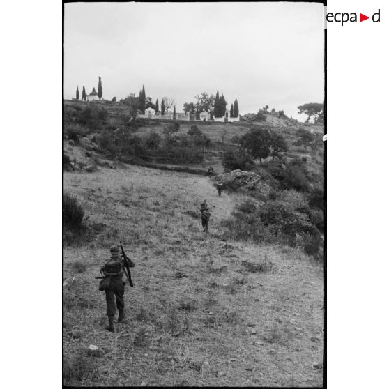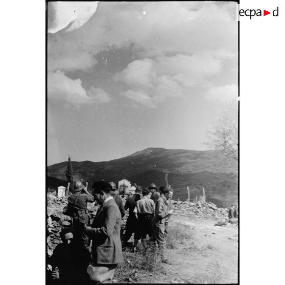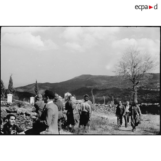 Près du cimetière du village de Murato, des partisans corses sont au côté de tirailleurs du 1er RTM (régiment de tirailleurs marocains) qu'ils vont guider jusqu'au col de San Stefano.