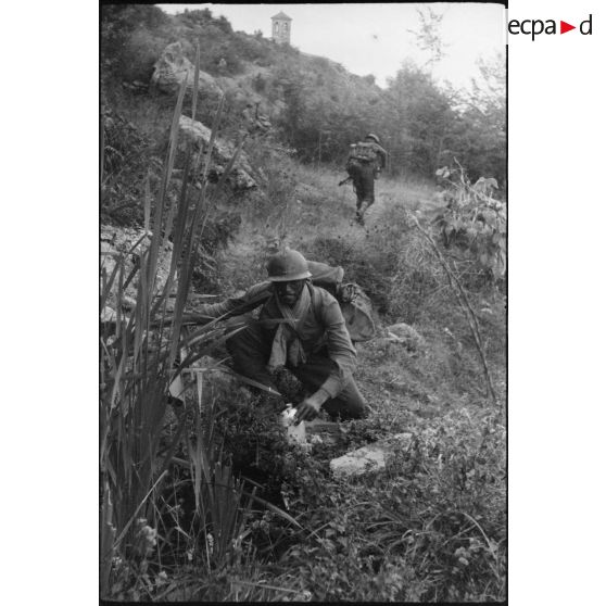 Lors de la progression de tirailleurs du 1er RTM (régiment de tirailleurs marocains) vers le col de San Stefano, l'un d'entre eux fait une halte.