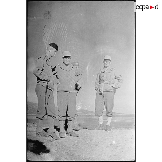Le colonel Pierre Boyer de La Tour du Moulin, commandant le 2e GTM (groupe de tabors marocains) s'entretient avec le capitaine Then (à gauche), commandant le 73e goum du 6e tabor.