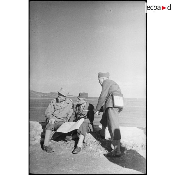 Au poste de commandement du général de brigade Charles Louchet, commandant l'infanterie divisionnaire de la 4e DMM (division marocaine de montagne), en rade de Saint Florent, celui-ci fait un point de situation avec le colonel Pierre Boyer de La Tour du Moulin, commandant le 2e GTM (groupe de tabors marocains).