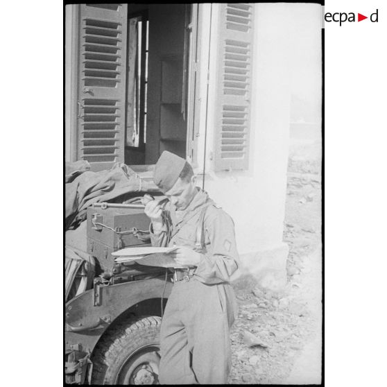 Un capitaine du DLO (détachement de liaison et d'observation) du IIIe groupe du 69e RAM (régiment d'artillerie de montagne) assure la liaison radio avec l'artillerie italienne qui appuie l'attaque française sur le col de San Stefano.