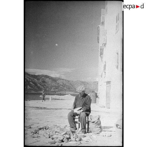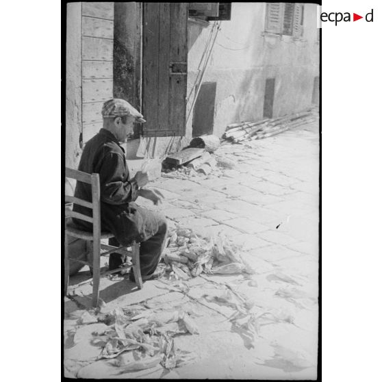 Dans un village, un paysan corse enlève les feuilles qui entourent des épis de maïs.