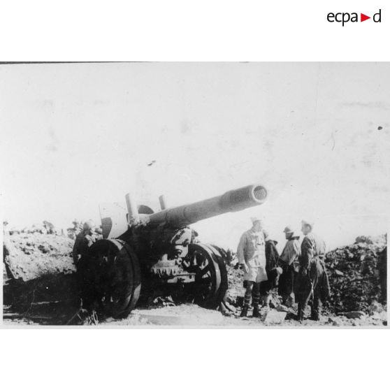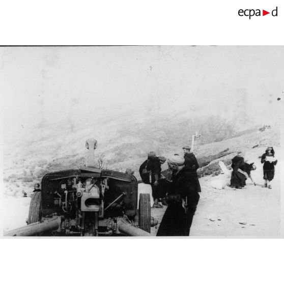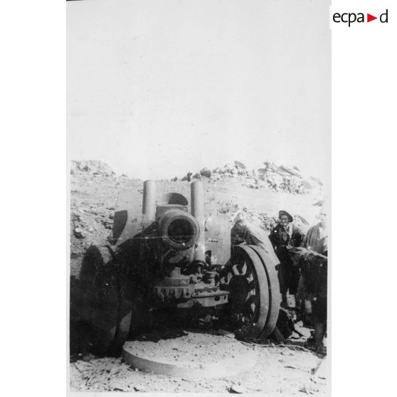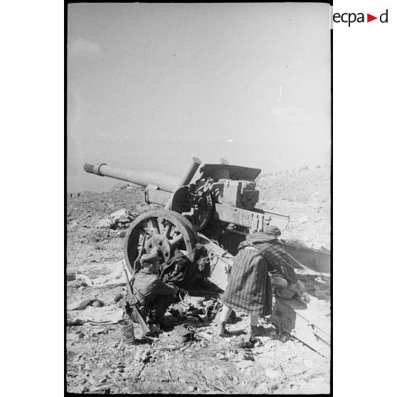 Des goumiers du 2e groupe de tabors marocains (GTM) examinent un canon de 152 mm, abandonné par les Allemands à l'issue des combats au col de Teghime.