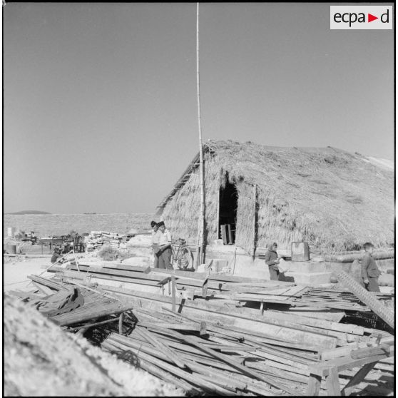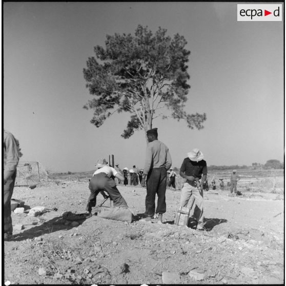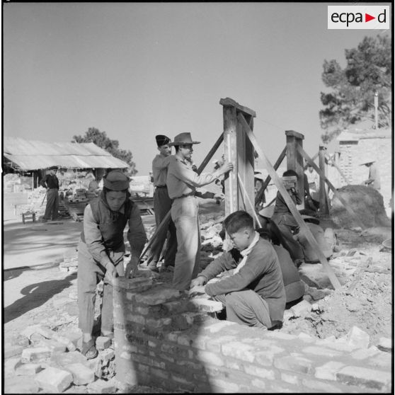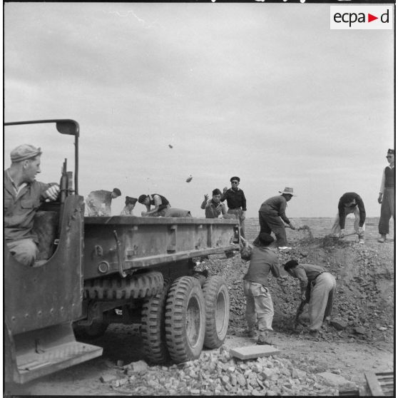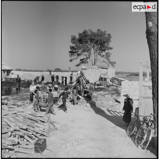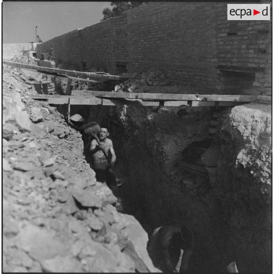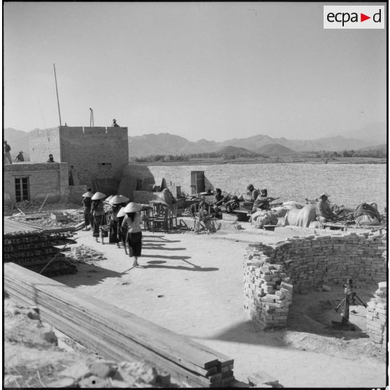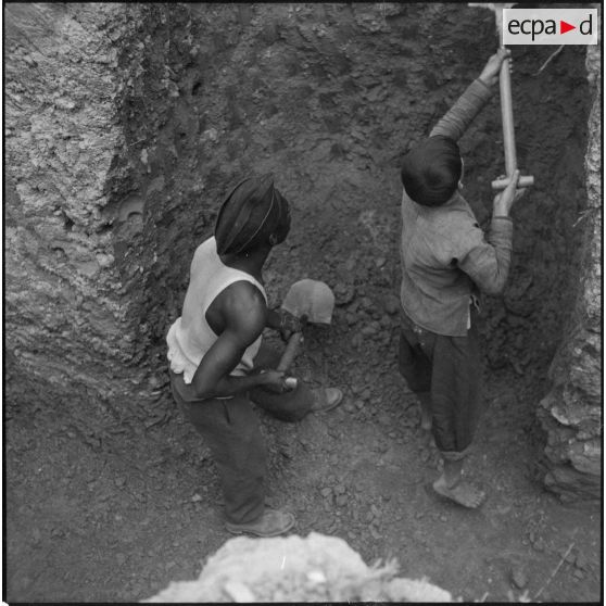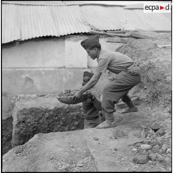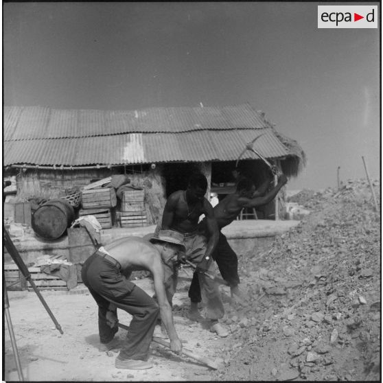 Tirailleurs du 27e bataillon de marche de tirailleurs sénégalais (BMTS) piochant et ramassant des gravats au poste de Da Phuc.