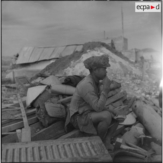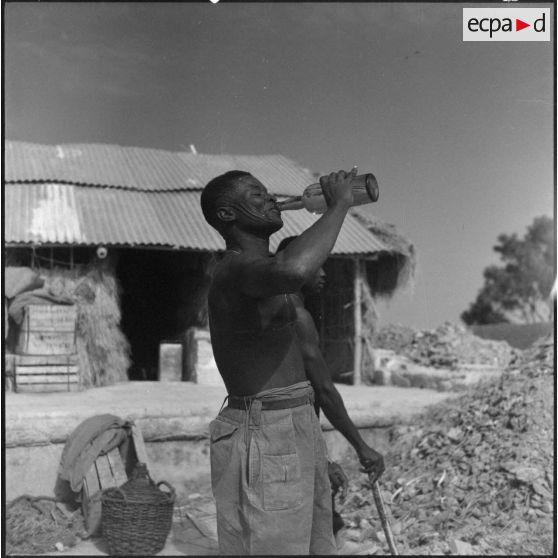 Un tirailleur du 27e bataillon de marche de tirailleurs sénégalais (BMTS) se désaltère pendant les travaux duu poste de Da Phuc.
