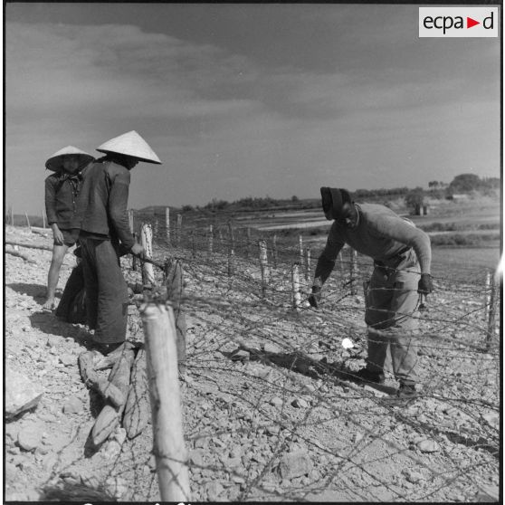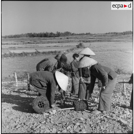 Pose de barbelés par des tirailleurs du 27e bataillon de marche de tirailleurs sénégalais (BMTS) et des travailleurs vietnamiens au poste de Da Phuc.