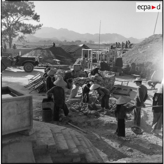 Préparation du mortier nécessaire à la constrcution des défenses du poste de Da Phuc avec le concours de travailleurs vietnamiens.