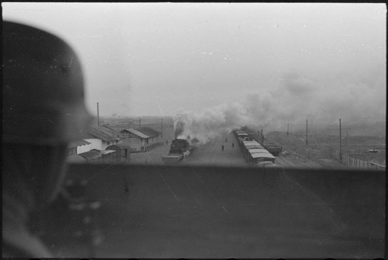 La locomotive numérotée 553052 tracte un train transportant des unités mixtes de la Wehrmacht (Luftwaffe et Pk.697).