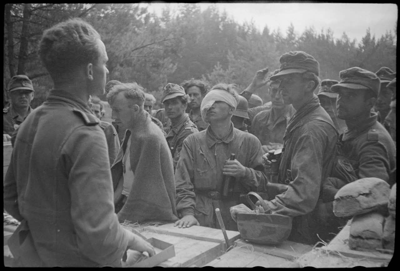 Après avoir défendu la ville de Vilnius, des fantassins allemands se ravitaillent.