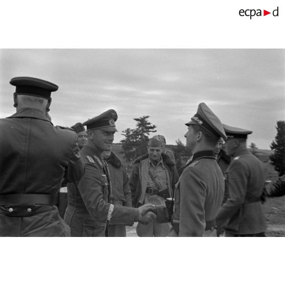 Le général (Generalmajor) Alfred Gause serre la main d'un officier d'état-major allemand, au centre de la photo, le général italien Ettore Bastico.