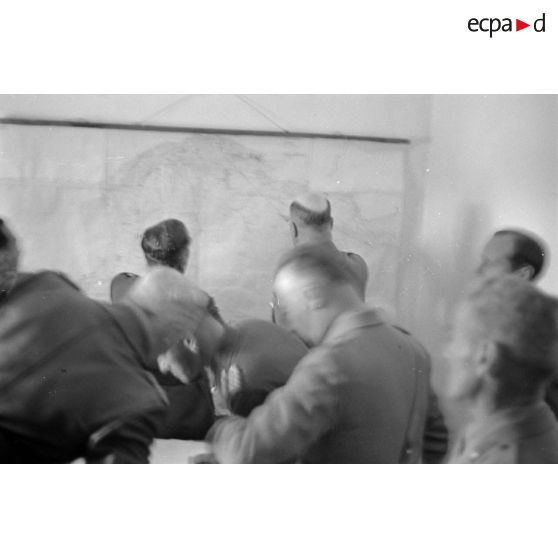 Entourés d'officiers d'état-major allemands et italiens, les généraux Cavarello et Crüwell étudient une carte murale.