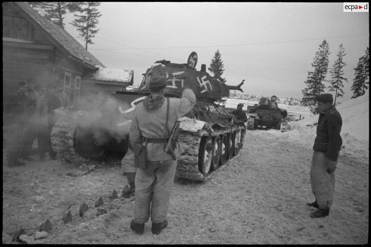 Deux blindés soviétiques T-34 capturés sont pris en charge par leur nouveau propriétaire.