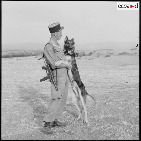 Le dressage se poursuit sur le terrain, dans la région de Tlemcen, lieu d'affectation du 5e REI. Les chiens marchent, rampent et courent aux côtés des soldats. Cet apprentissage militaire lie les animaux et les hommes du 1er bataillon qui travaillent en bonne harmonie.