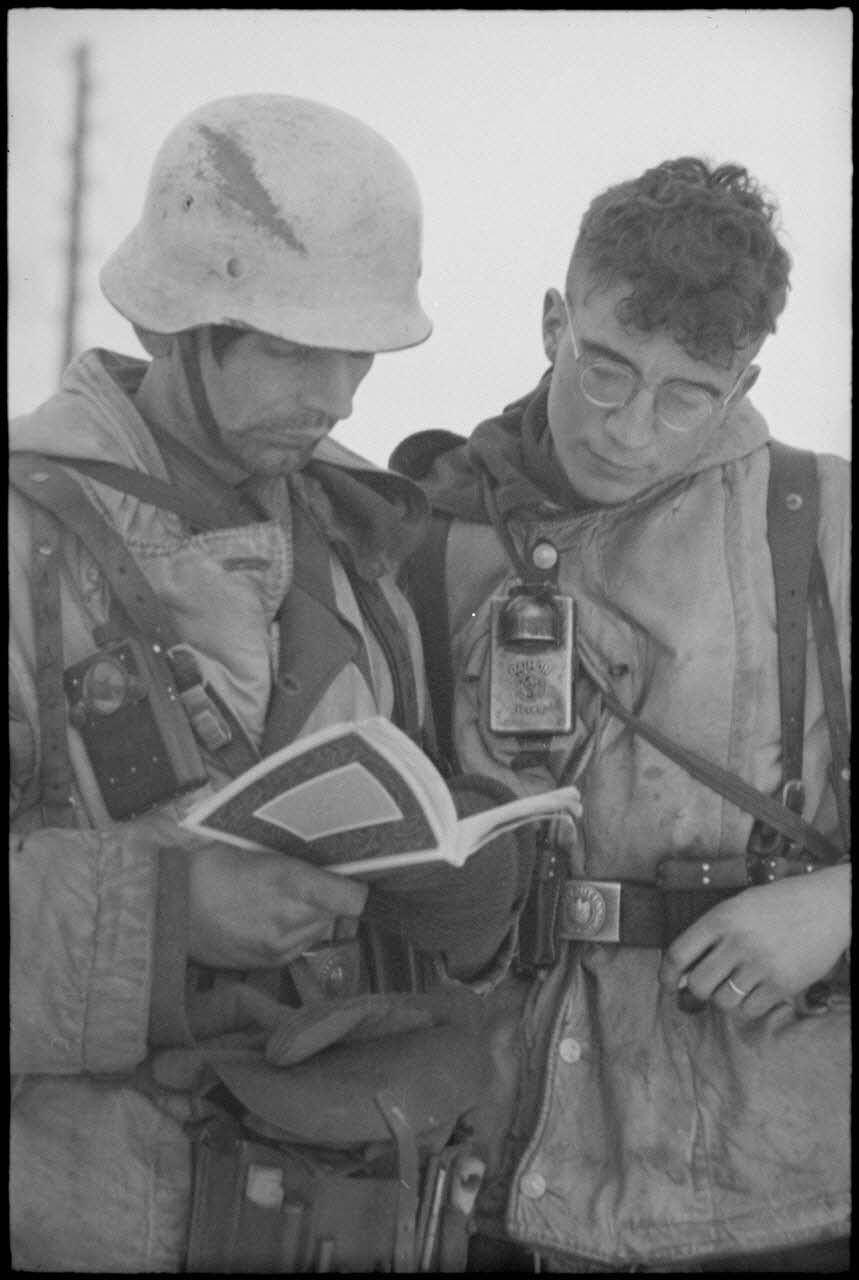 Un fantassin allemand, affecté à la sécurisation d'une voie ferrée, semble souffrir du pied.