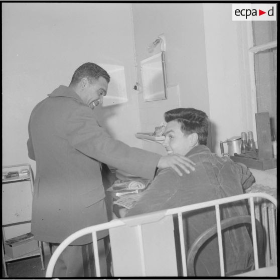 Visite du colonel Rafla du 1er RTA (régiment de tirailleurs algériens) à deux appelés hospitalisés à l'hôpital militaire Maillot d'Alger.