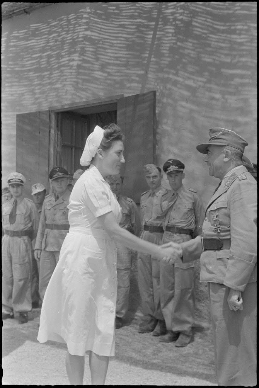 Au foyer du soldat (Soldatenheim) de Skaramangas où est basé le 1er groupe du Seeaufklärungsgruppe 126, une infirmière est mis à l'honneur.