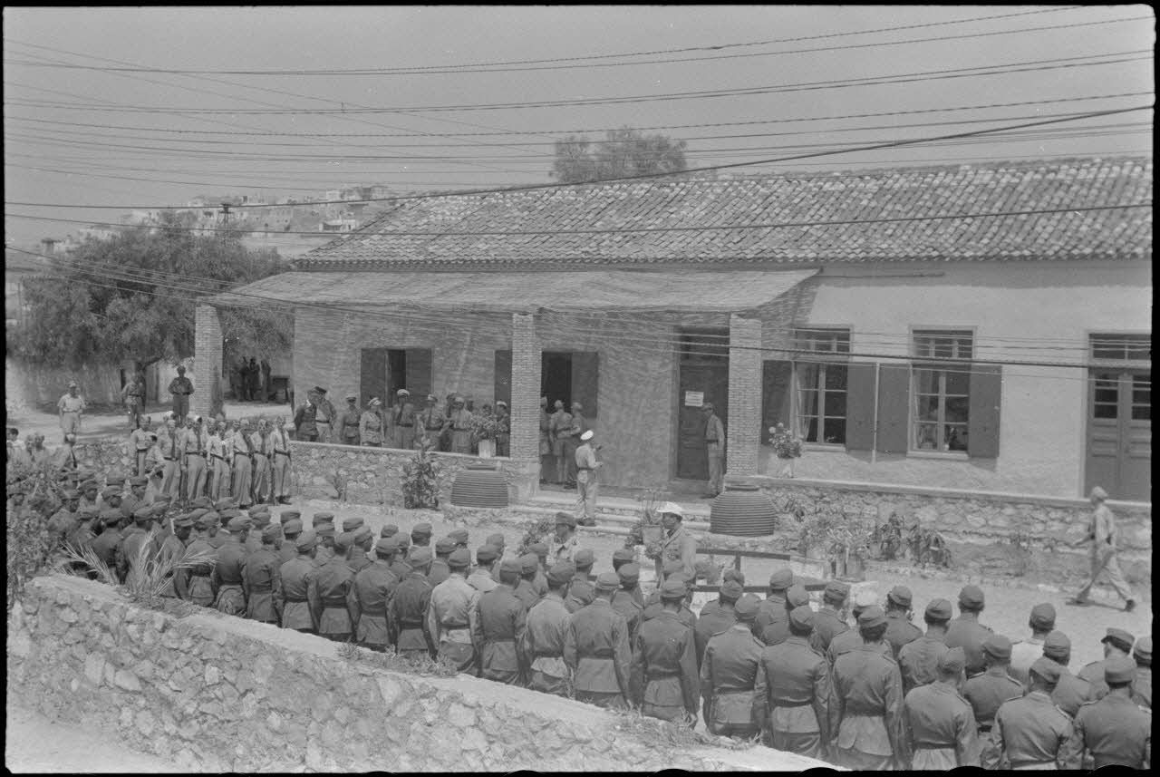 Devant le foyer du soldat (Soldatenheim) de Skaramangas, un général de l'armée de terre allemande commande une prise d'armes.