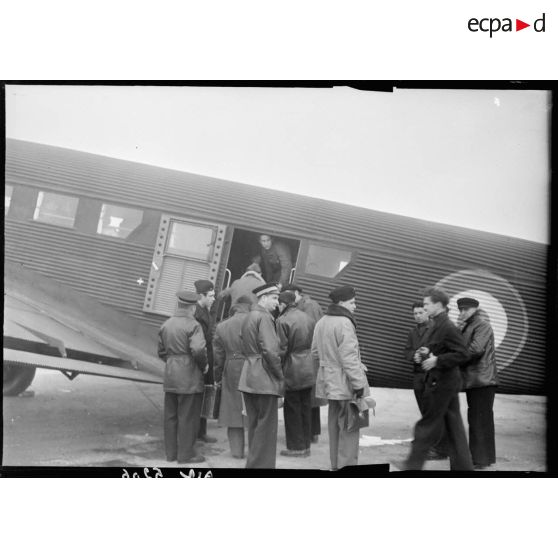 Les artistes du "Vieux Colombier" quittent leur quartier parisien dans un car Citroën type 45 pour rejoindre leur avion.
