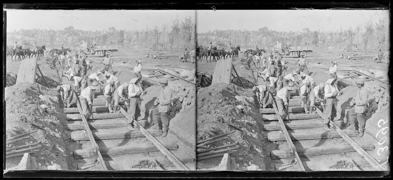 Devant Montdidier, Somme, remise en état de la voie ferrée. [légende d'origine]