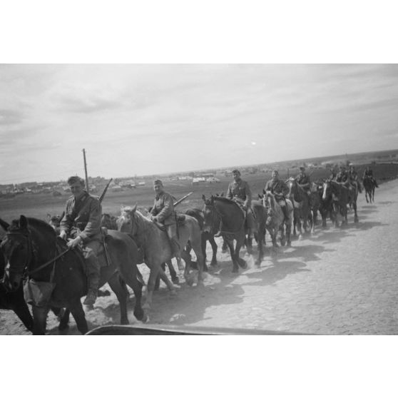 Des cavaliers allemands progressent sur une route pavée.