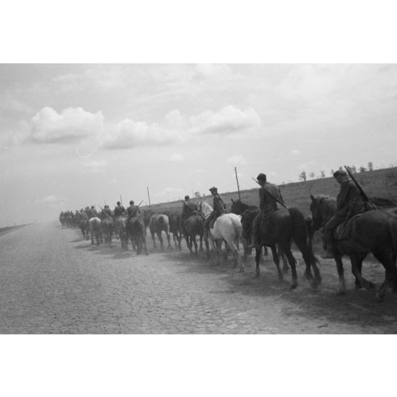 Campagne de vaccination, progression de cavaliers allemands sur une route importante (Rollbahn), un canon de 3,7 cm Flak.