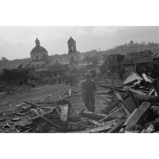 Déblaiement d'un village détruit par les combats.