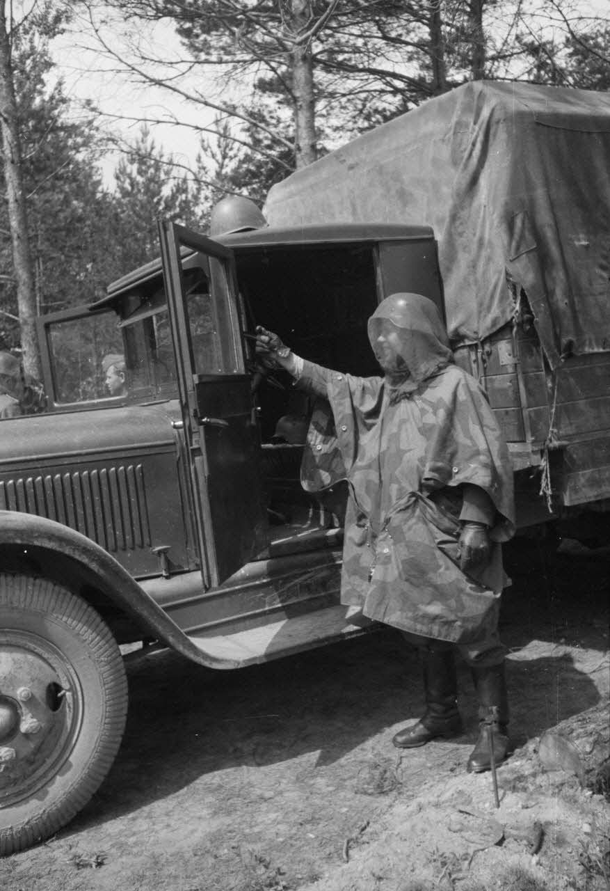 Devant un camion ZIS d'origine soviétique, un fantassin de la Luftwaffe équipé d'une moustiquaire et d'un poncho.
