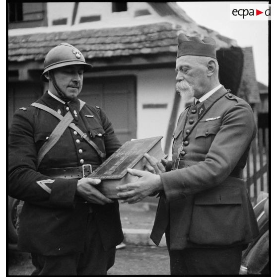 Dans un temple un pasteur remet une bible à un gendarme dans le secteur de la 5e armée.