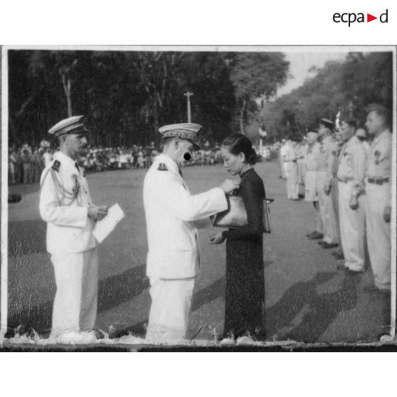 Lors du défilé du 14 juillet 1946 à Saigon, l'amiral Thierry d'Argenlieu décore madame Lê-van-Thoi de la Légion d'honneur.