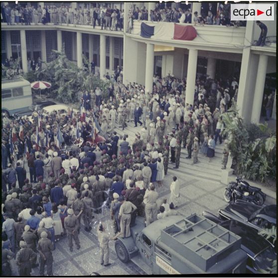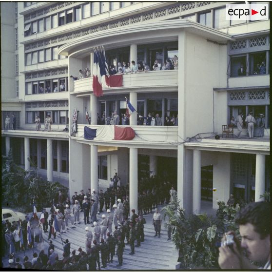 La population venue particulièrement nombreuse stationne devant le gouvernement général dont les allées sont décorées par des drapeaux français.