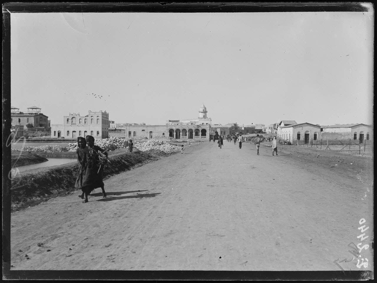Djibouti. Sur la route, au fond, la mosquée. [légende d'origine]