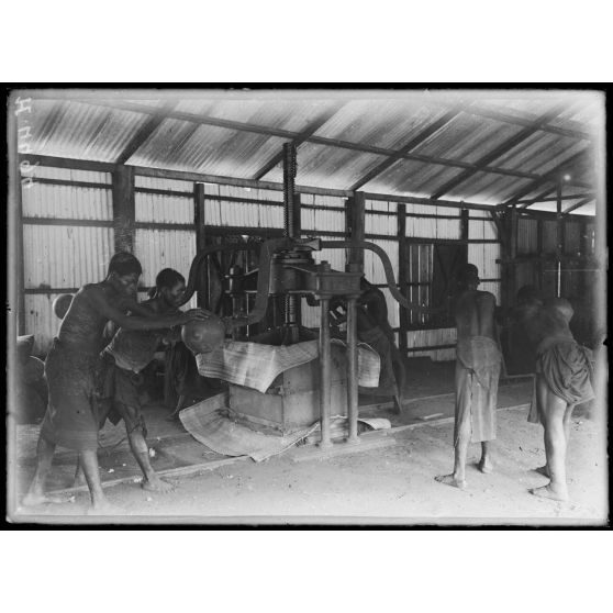 Djombé. Pressage du kapok.