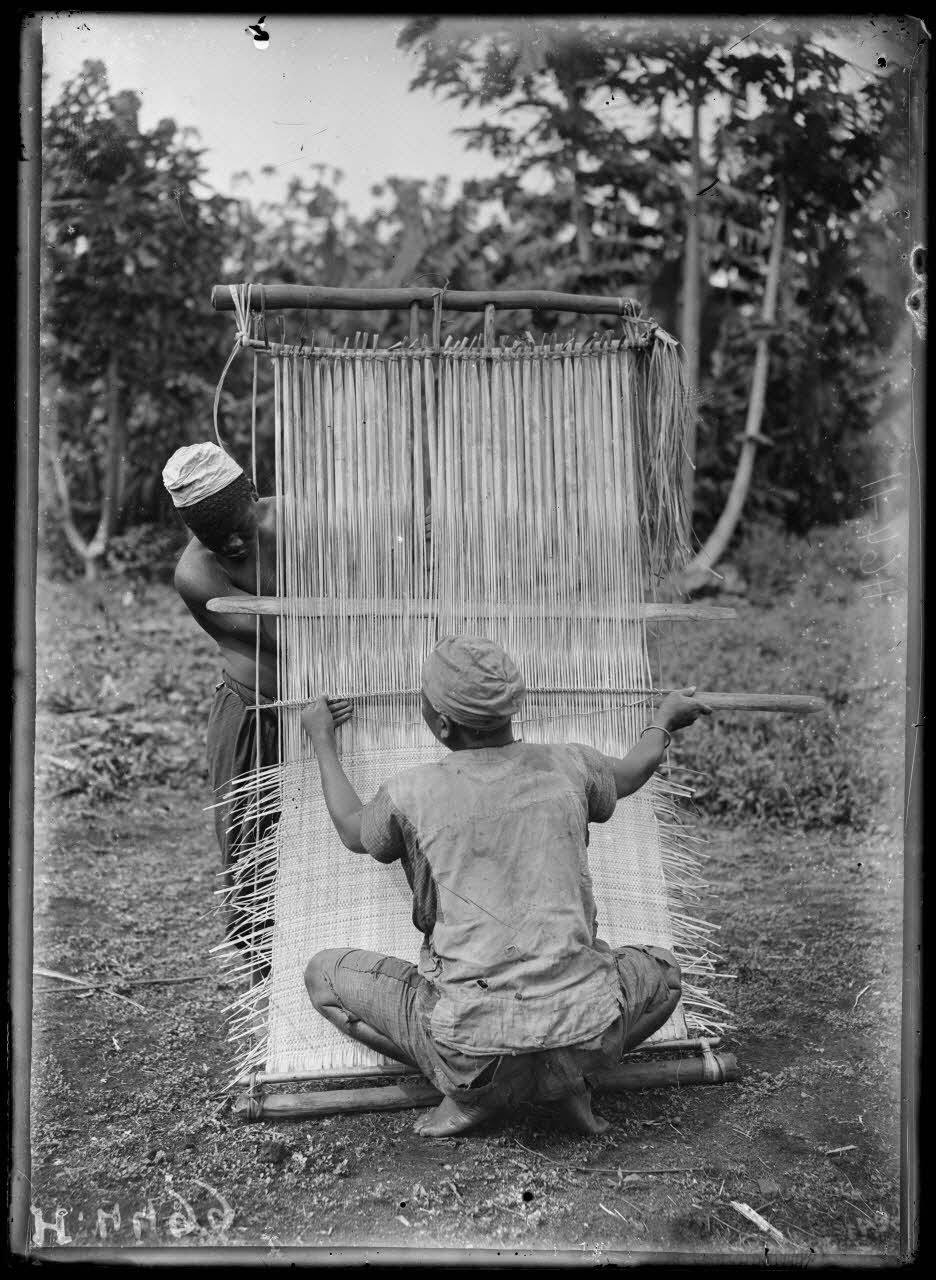 Des indigènes de l'ethnie Banum (ou Bamoun) confectionnent avec des feuilles de pandanus des nattes tressées qui servent à emballer diverses marchandises.