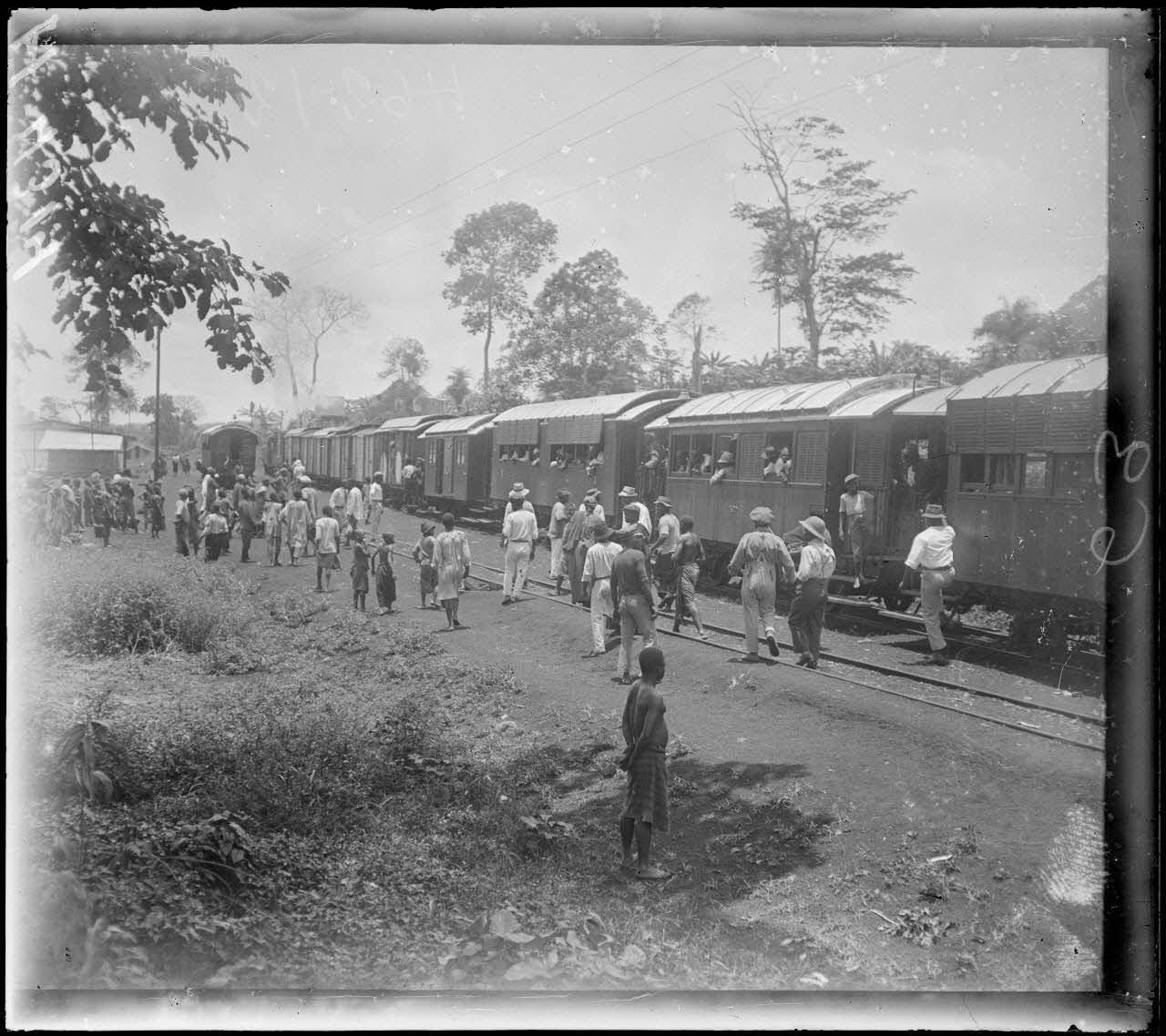 Vue de la foule des indigènes à la gare de Njombé, sur la ligne du Chemin de fer du Nord, au moment où arrive un train.