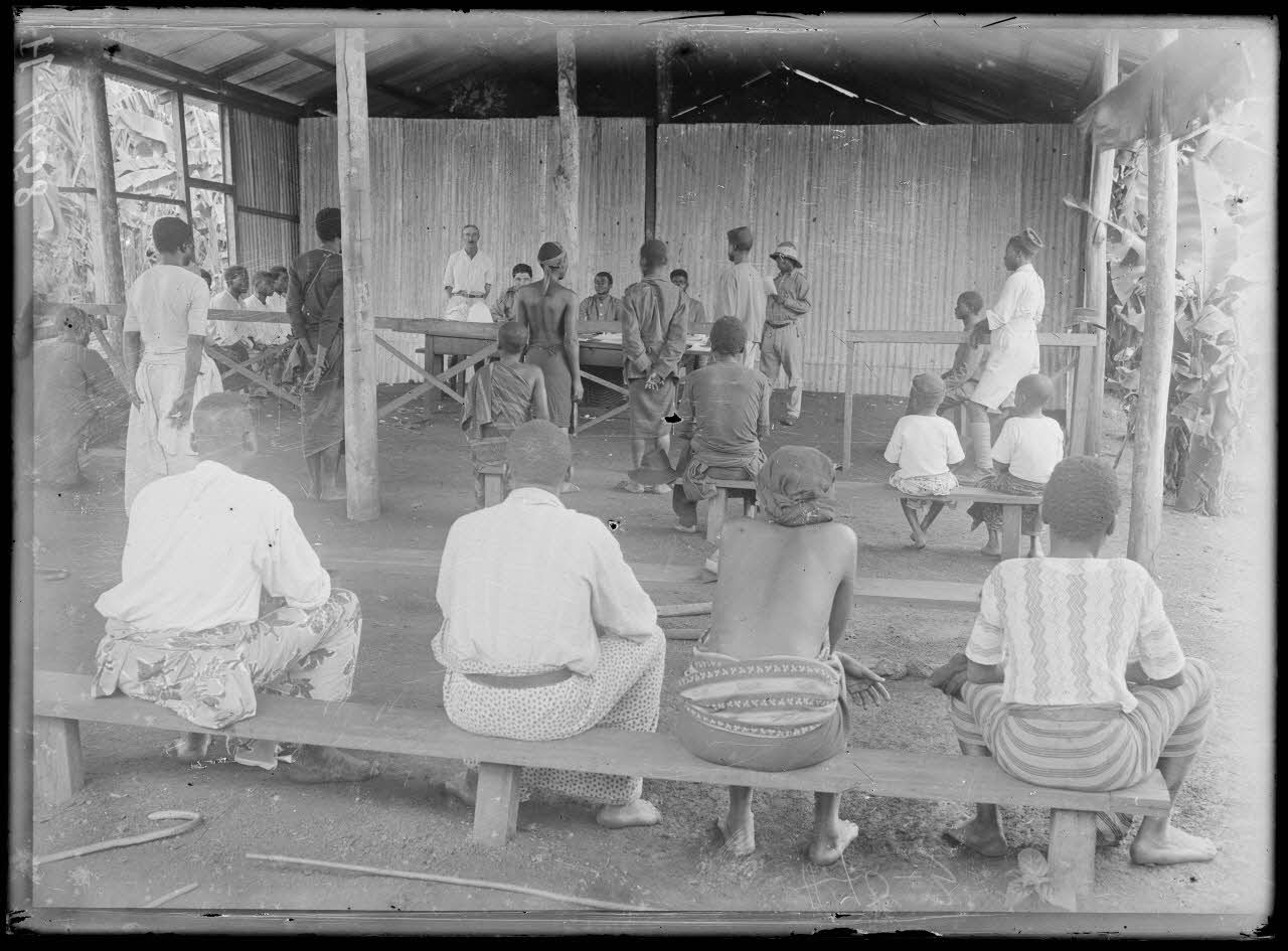 A Njombé, une séance du tribunal indigène se tient sous une grande case, sous la supervision de deux européens.