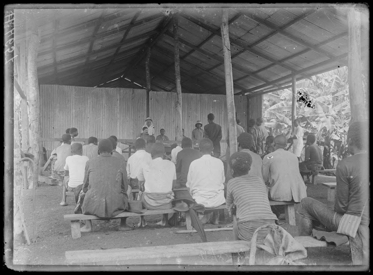 A Njombé, une séance du tribunal indigène se tient sous une grande case, sous la supervision de deux européens.