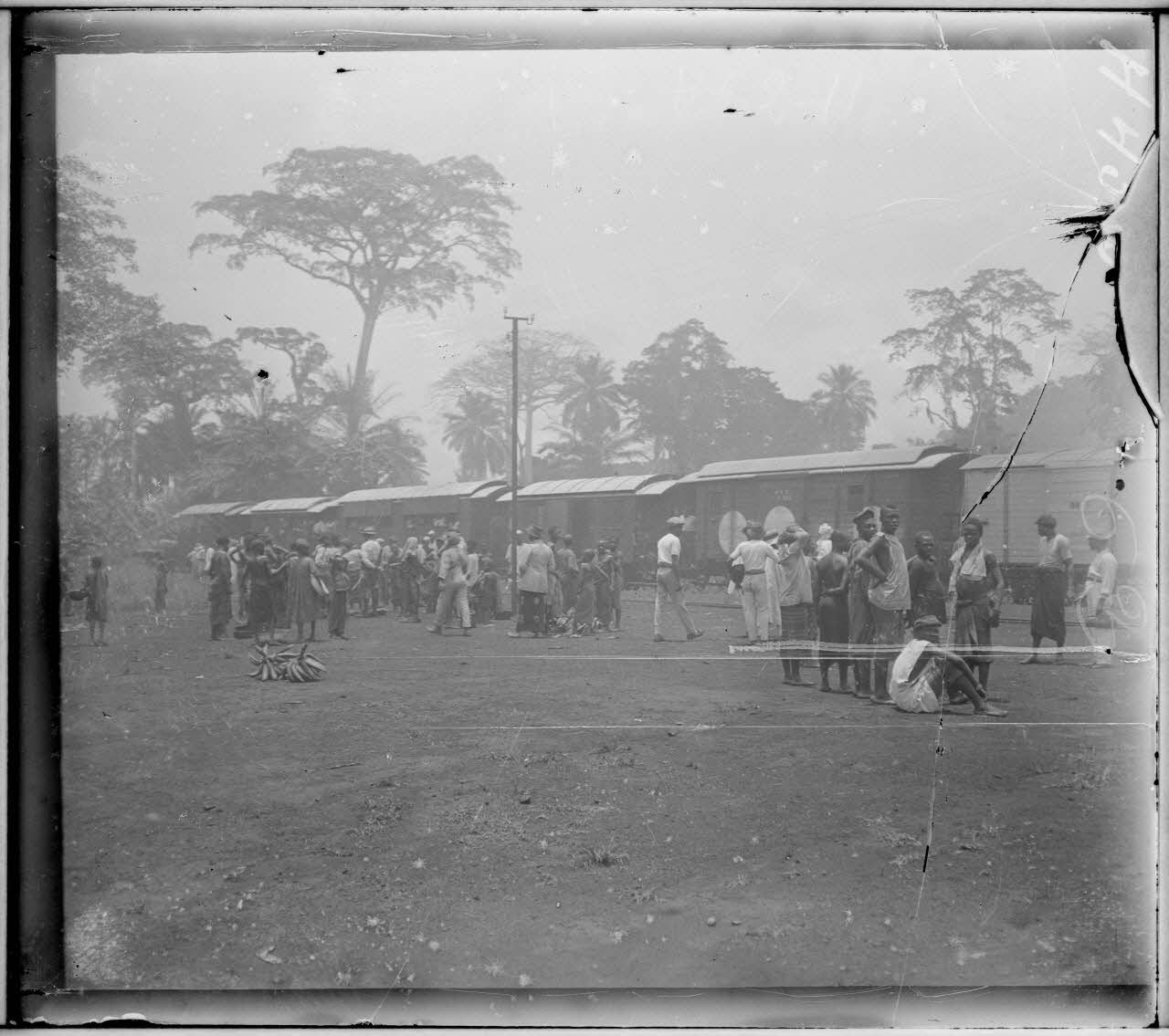 Un train stationne en gare de Njombé. La population indigène se tient aux abords des wagons et regarde l'objectif.