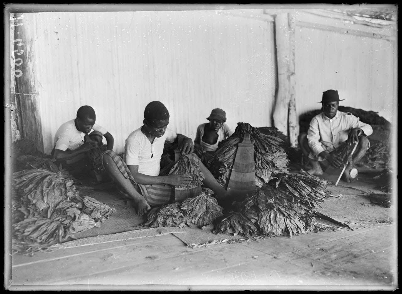 Assis sur des nattes, les employés d'une plantation de tabac mesurent les bottes de tabac avant leur mise en ballots.