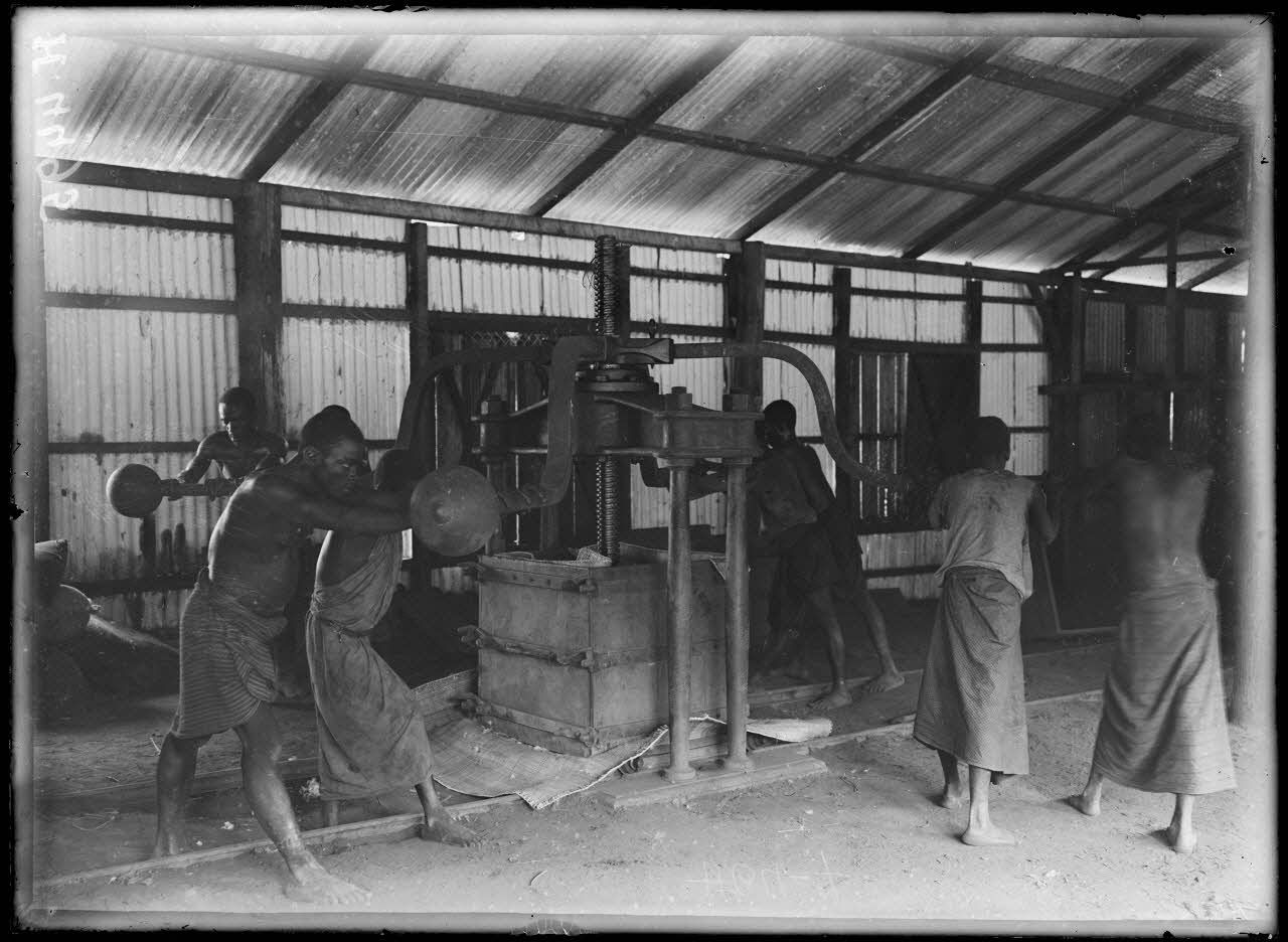 Dans un atelier de Njombé, les employés manoeuvrent le vérin d'une presse pour comprimer du kapok entre deux nattes qui serviront d'emballage.