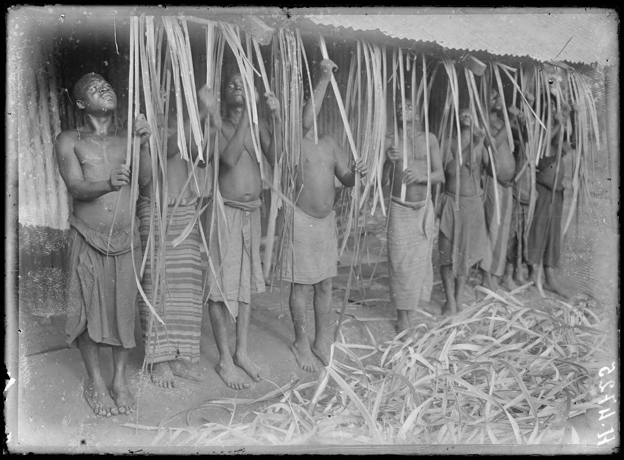Djombé. Raclage des feuilles de Pandanus. [légende d'origine]