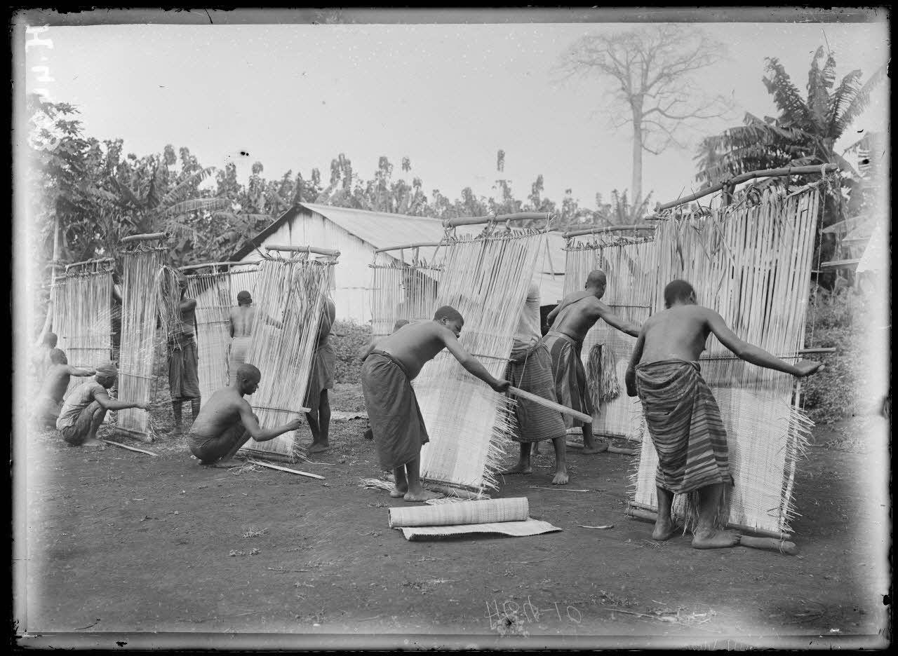 Des indigènes de l'ethnie Banum (ou Bamoun) confectionnent avec des feuilles de pandanus des nattes tressées qui servent à emballer diverses marchandises.