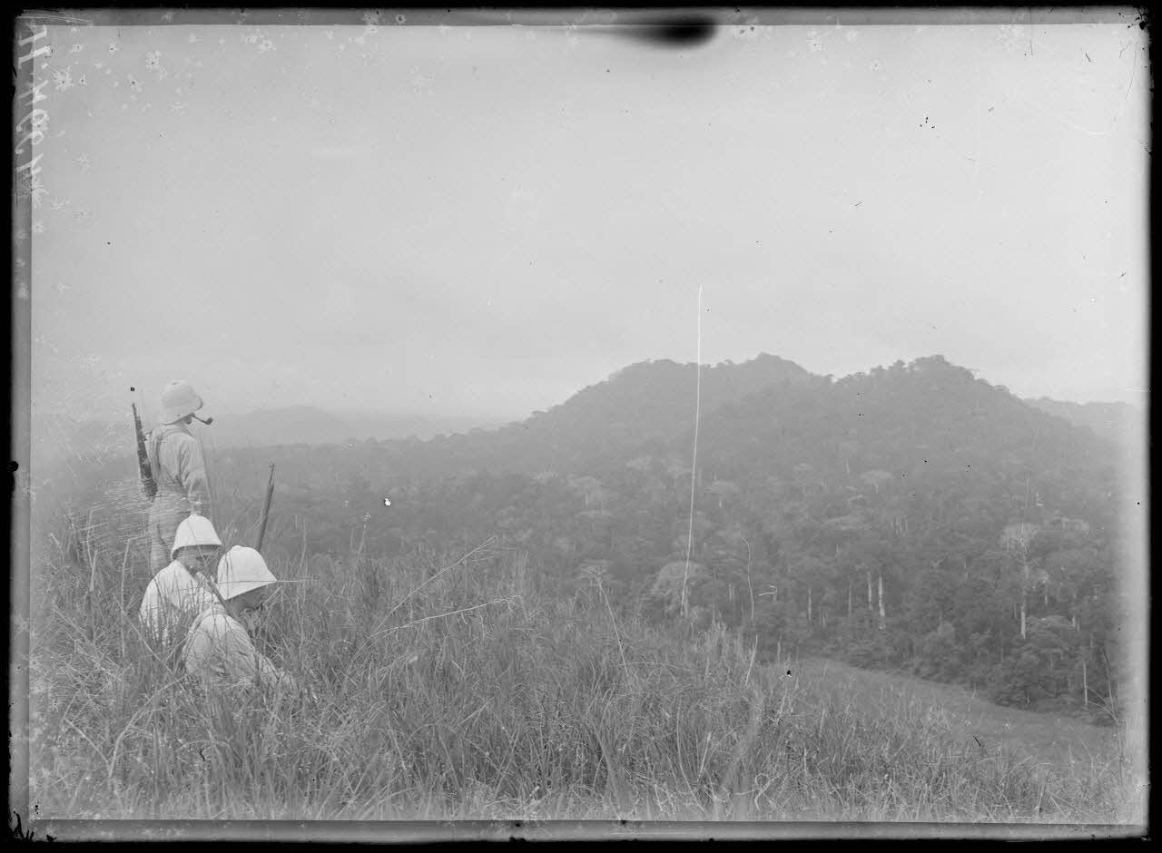 Les accompagnateurs de la mission photographique regardent le lointain en direction de la plantation de Djombé, depuis le sommet de la montagne pelée.