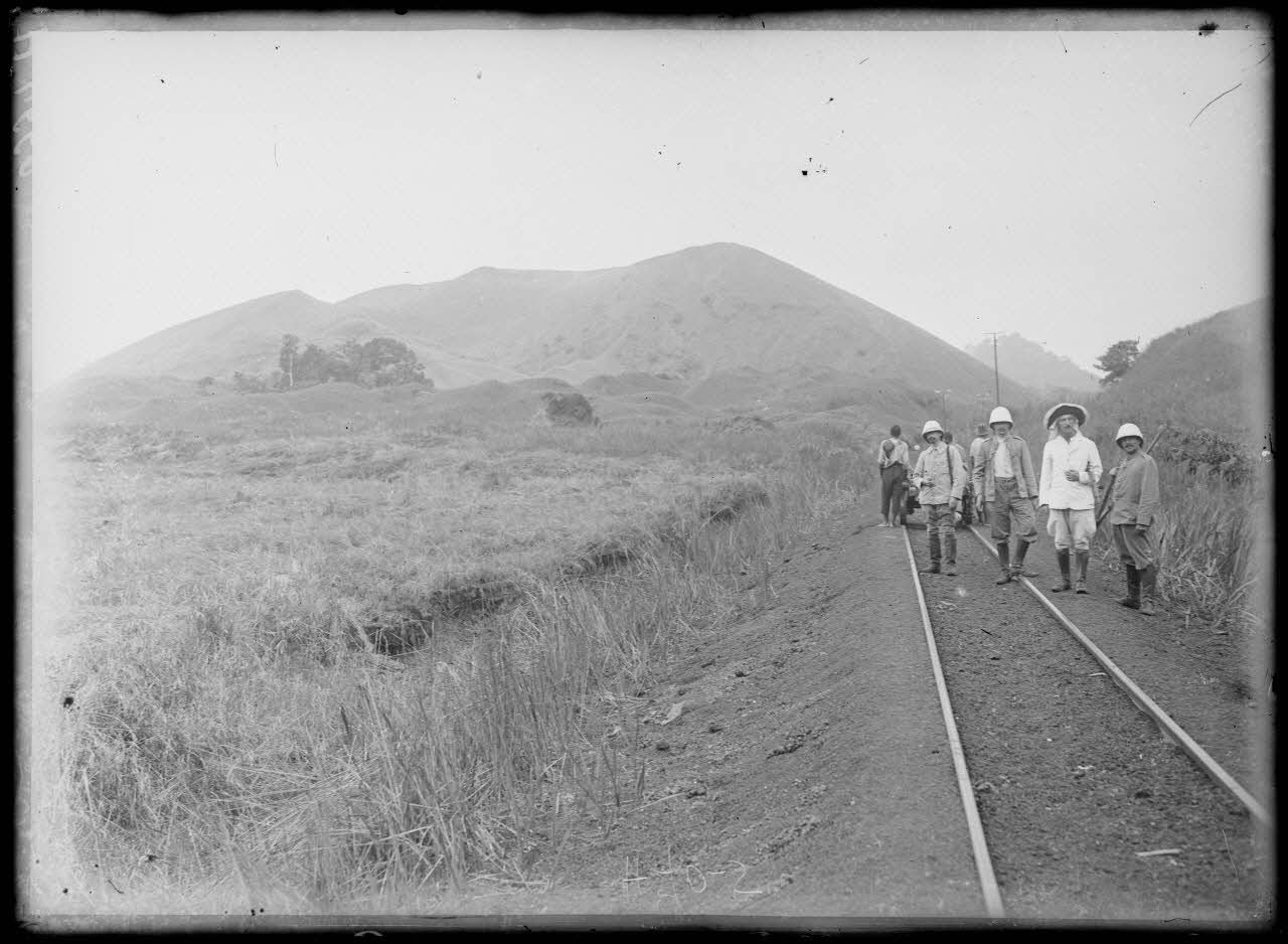 En déplacement avec une draisine sur la voie du chemin de fer du Nord, près de Djongo, les accompagnateurs de la mission photographiques sont pris en photo devant un volcan appelé "la montagne pelée". Le cratère est visible au flanc de la montagne.