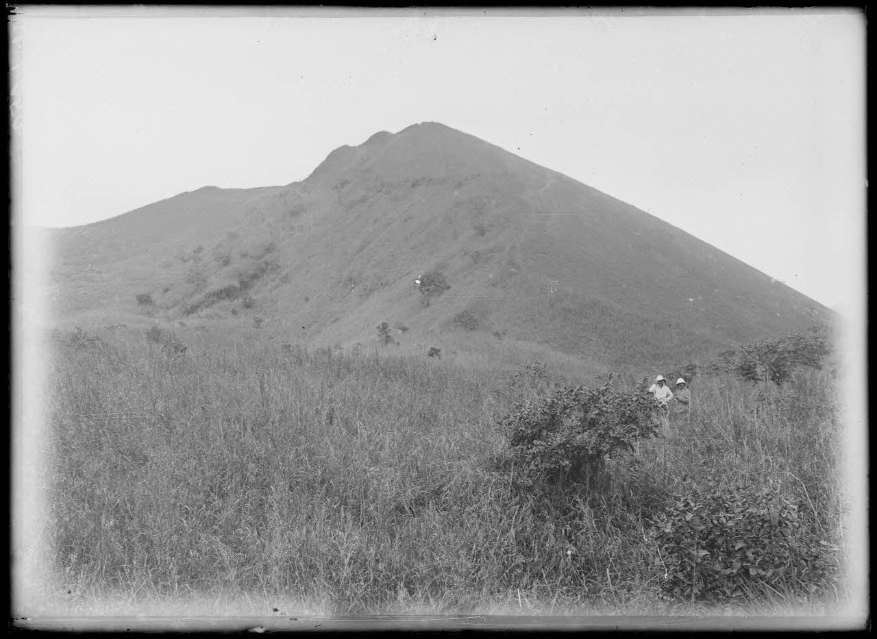 A Djongo, la mission photographique a fait l'ascension d'un volcan. Deux hommes sont photographiés près du bord de l'ancien cratère.