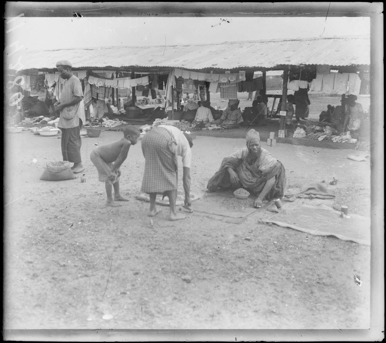 Au marché de Douala, une camerounaise se penche sur un étal de denrées alimentaires vendues à même le sol par un commerçant. En arrière-plan, une rangée de boutiques propose des tissus, des vêtements et divers objets.