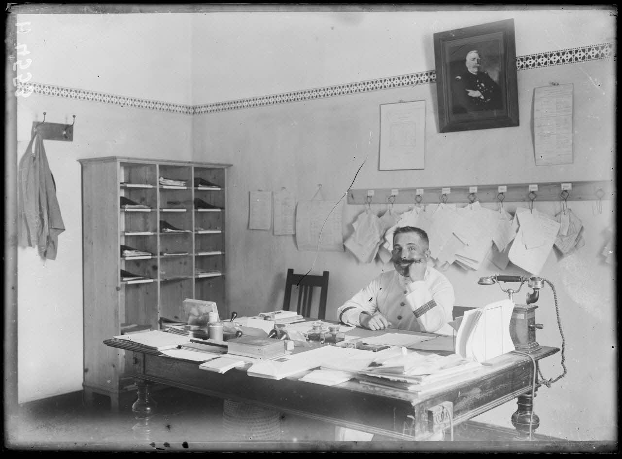 Un capitaine travaillant à la direction des Chemins de fer du Centre (ligne Douala-Eseka) est photographié à son bureau, sous un portrait du maréchal Joffre.