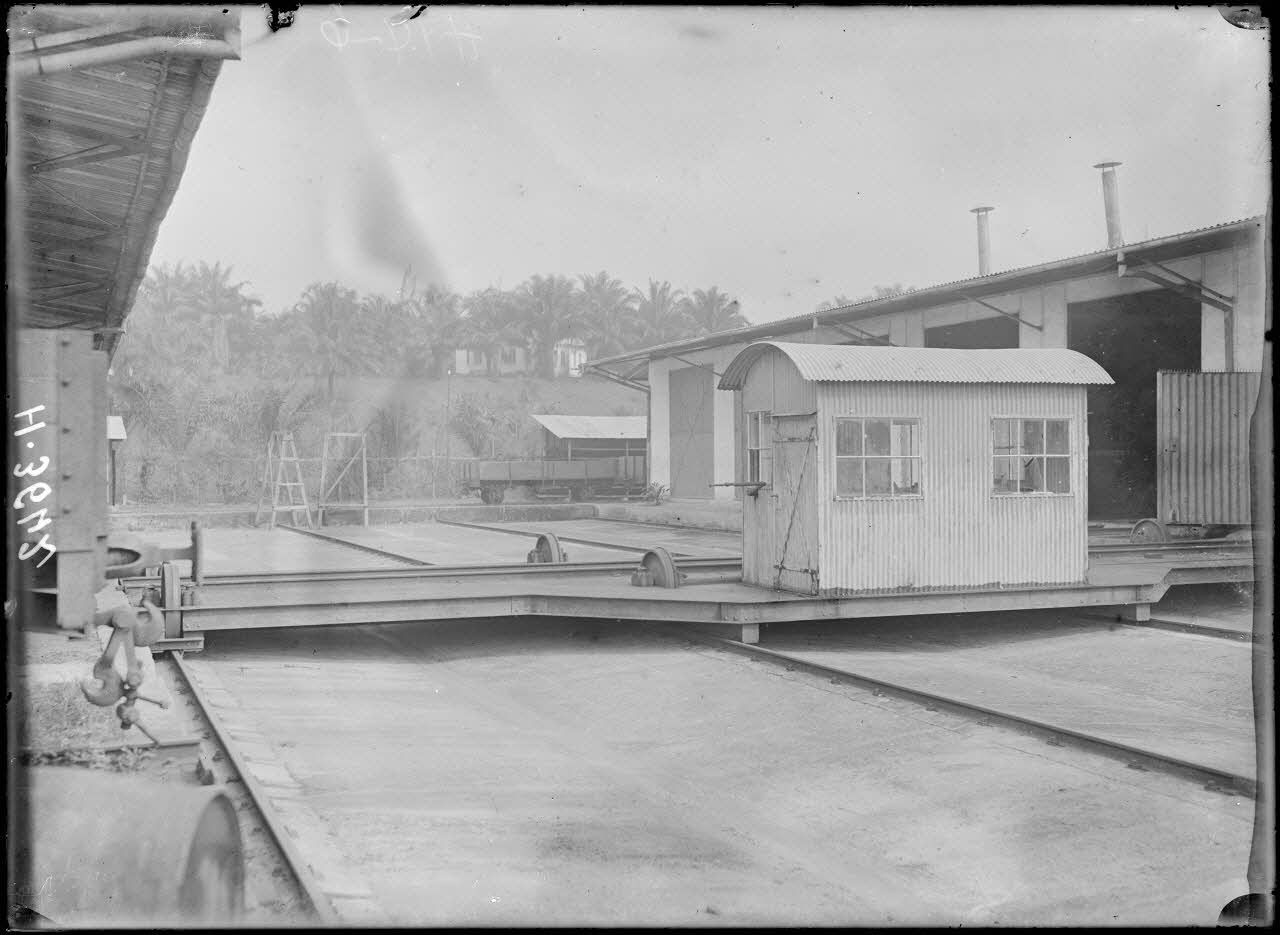 Douala. Dépôt du chemin de fer du centre. Pont transbordeur entre dépôt et ateliers. [légende d'origine]