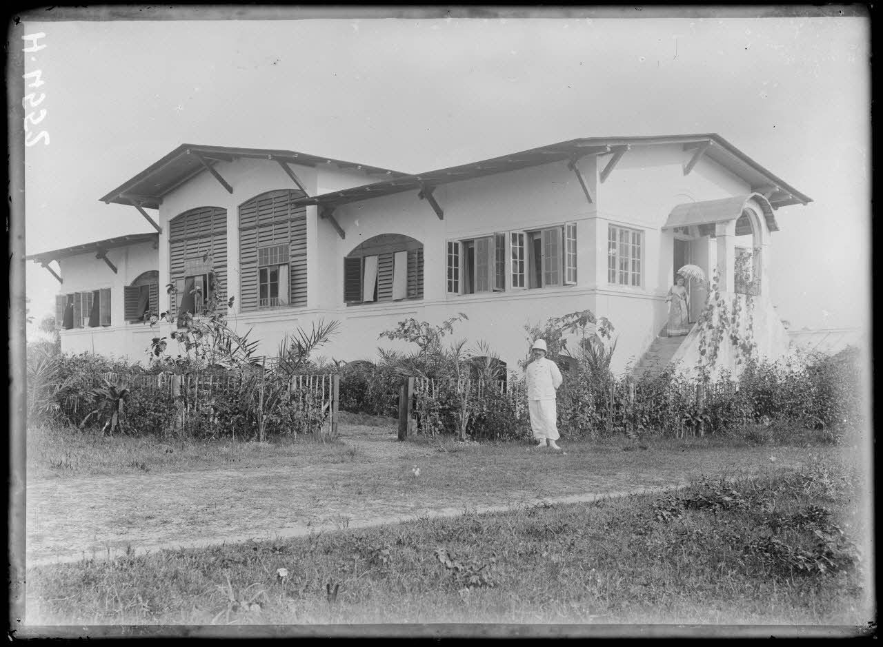 Un homme en tenue coloniale et une femme se tiennent devant l'immeuble n°12 ds travaux publics, à Douala.