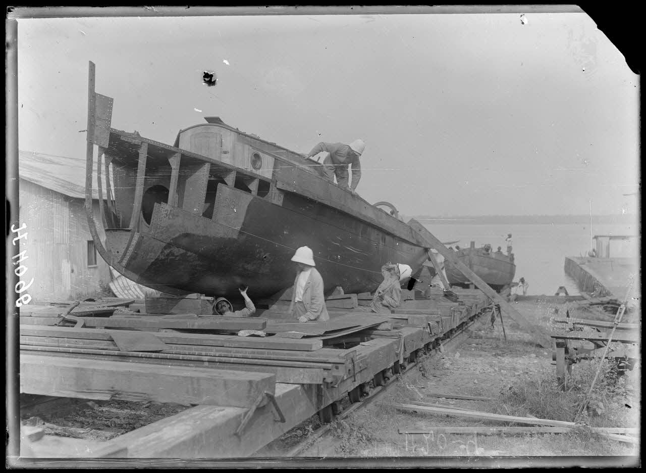 - Sur les docks flottants, près des dragues, le bâtiment "Odin" (qui cherche à couler la canonnière anglaise "Dwarf" en octobre 1914) est en cours de réparation. Sur les quais, les ateliers assistent les réparations. Dans la scierie, une bille de bois est hissée puis mise sur un chariot